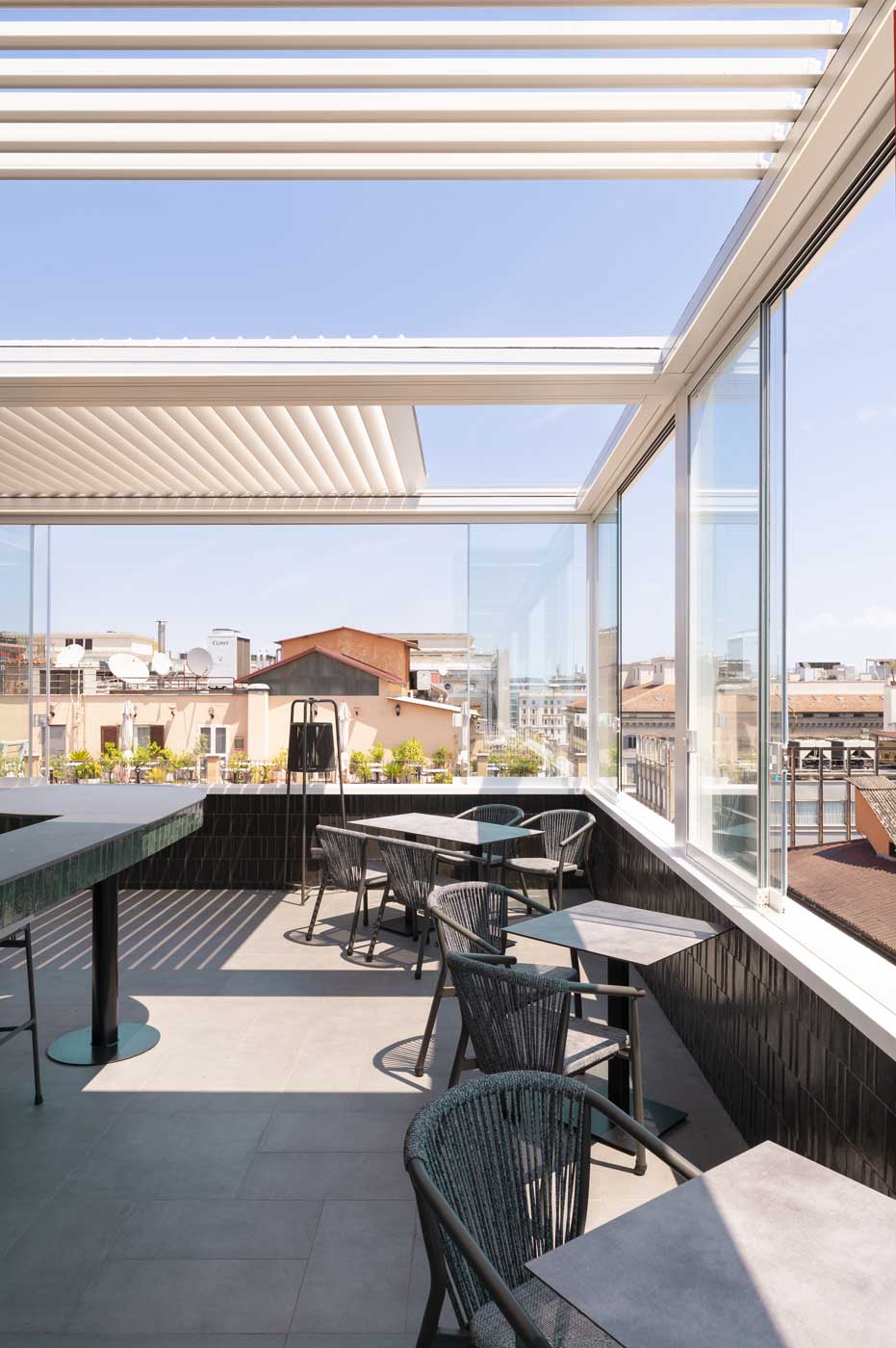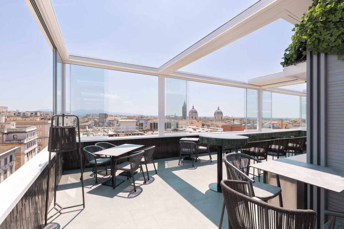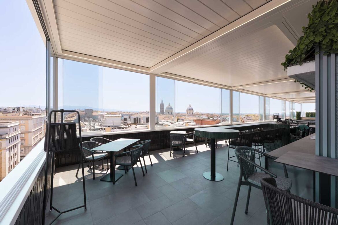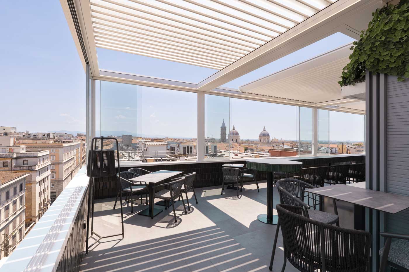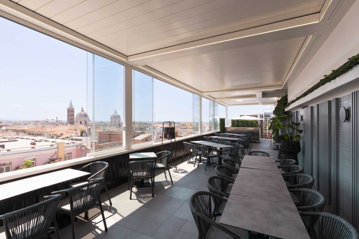 Il servizio fotografico per KE Outdoor Design è stato realizzato con l’obiettivo di valorizzare le pergole con tetto scorrevole installate sul rooftop dell’Hotel Universo, un contesto raffinato dove design e funzionalità si incontrano con la vista panoramica sui tetti di Roma.